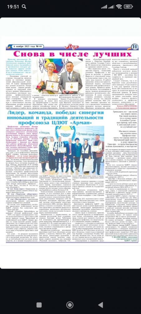 БІЗ ТУРАЛЫ БАҚ-та! Г.Шамиғанова, «Арман» балалар-жасөспірімдер шығармашылық орталығының өлкетану музейінің меңгерушісі. "Лилер, команда, победа: синергия инноваций и традиции в деятельности профсоюза ЦДЮТ "Арман" //Луч аудандық қоғамдық-саяси газеті. - 6 қараша 2025. No 44. - 11 бет.