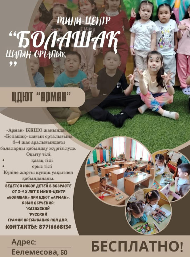 "Арман" БЖШО МКҚК жанындағы "Болашақ" шағын орталығына 3,4 жастағы балаларды қабылдау жүруде. Оқыту тілі: қазақ, орыс. Қысқартылған күнде болу.