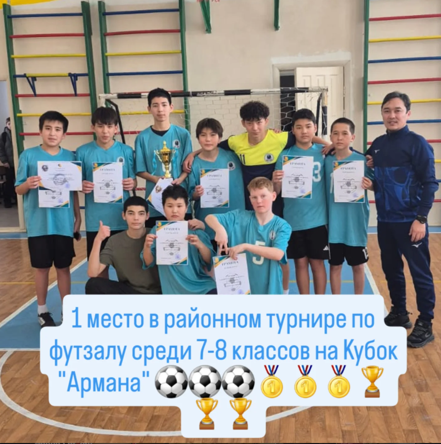 Арман кубогына 7-8 сыныптар арасында футзалдан аудандық турнирде 1 орын" № 4 ЖББМ базасында "Жеткіншек" аула клубының командасы иеленді.