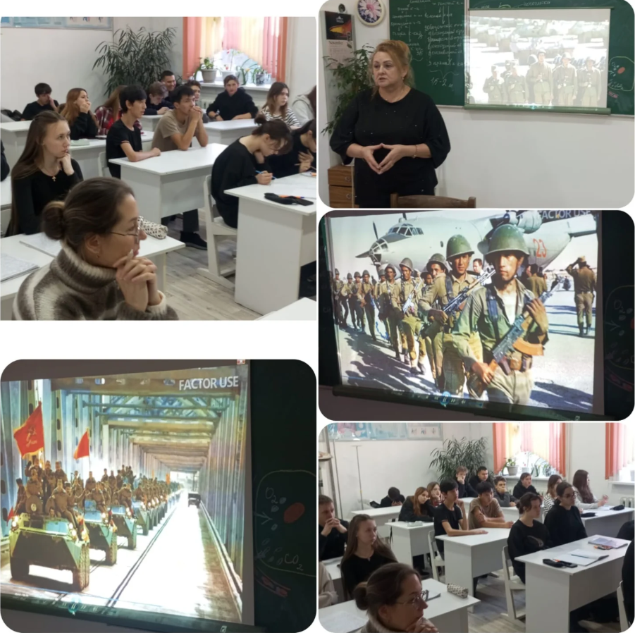 Біздің орталық Ауған соғысы оқиғаларына арналған тақырыптық кездесу өткізді. Психолог Галина Аркадьевна Анисимова кәсіптік бөлім студенттерімен батылдық, парыз және бейбітшіліктің құны туралы ашық әңгіме өткізді.