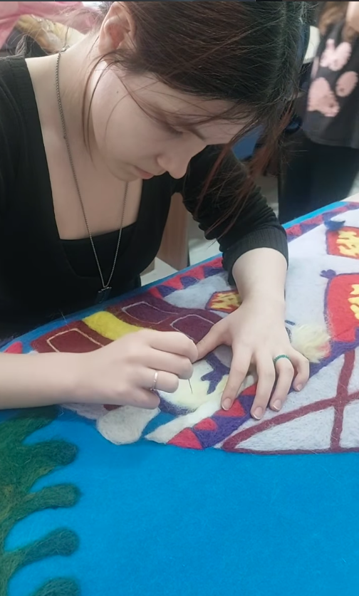 Сәндік-қолданбалы өнер үйірмесінде (педагог Андросова Тамара Ивановна) білім алушылар жүнмен сурет салу техникасын (құрғақ киіз басу) меңгеруде.